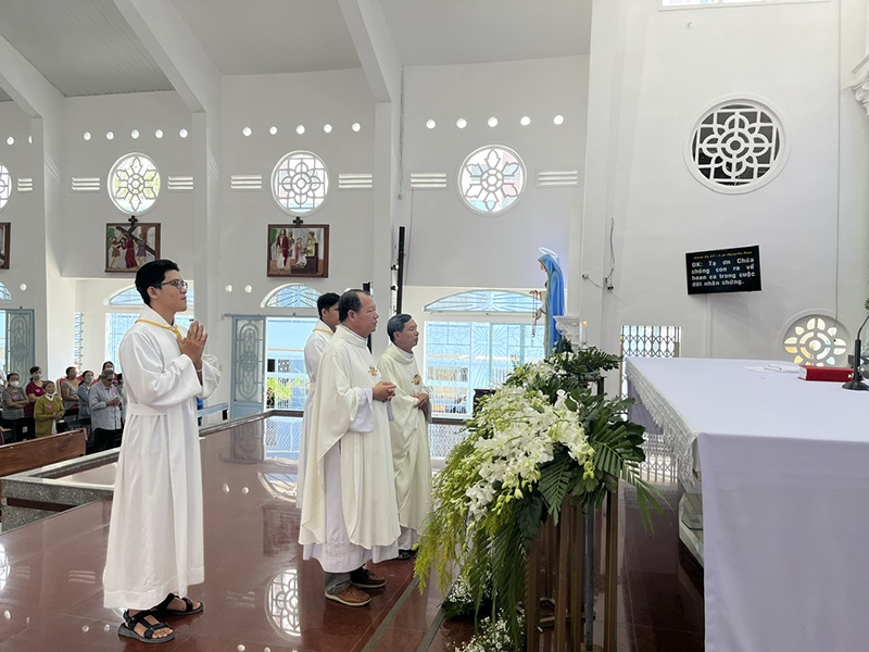 Ngay từ sáng sớm ngày 20 /11/2202, các thành viên Caritas đã tề tựu trong sân đón khách về tham dự và để hướng dẫn chỗ xe cùng tham quan ngôi Thánh đường Bình An với khuôn viên rộng lớn và thoáng mát. Mỗi giáo xứ có 12 khách được mời về tham dự, mỗi khách nhận được một con số trong lôgô trái tim và gắn trên ngực áo. Được biết đây là con số may mắn để nhận thêm quà thưởng trong bữa cơm đồng bàn cùng nhau. Đúng 9g00, Thánh lễ cầu bình an cho quý khách được cha Đaminh chủ sự cùng với cha Giuse Nguyễn Văn Khiêm – cha sở giáo xứ Mông Triệu. Trong bài giảng, cha Đaminh tâm tình chia sẻ: Trong cuộc sống có rất nhiều những khó khăn: có người khó khăn về vật chất, có người khó khăn về tinh thần, có người khó khăn về kiến thức. Ai trong chúng ta cũng có khó khăn riêng và hãy cùng cầu nguyện để xin Chúa giúp sức để chúng ta vượt qua được những khó khăn trong cuộc sống.