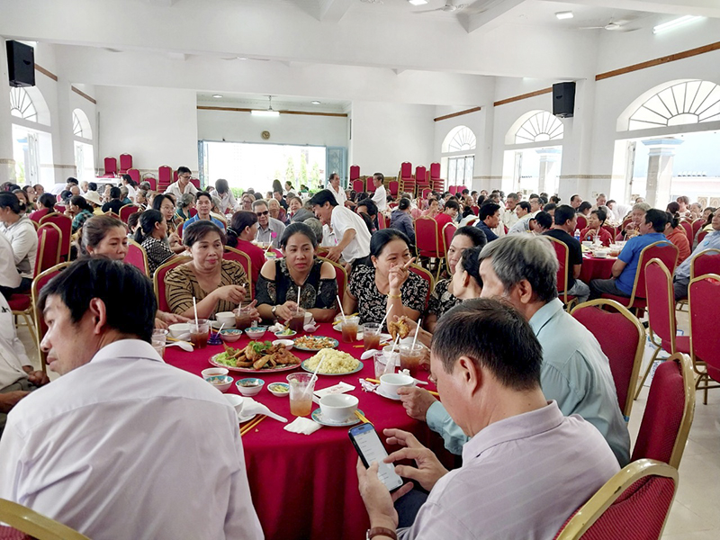 Sau Thánh lễ, mọi người tập trung về Hội trường với 20 bàn tiệc đang chờ đón quý cha cùng quý khách. Bài hát “Bài ca phục vụ” của Lm Mi Trầm mở màn cho bữa cơm nhân ái cũng là để nói lên tinh thần Caritas với khẩu hiệu: Yêu thương – Phục vụ. Sau phần làm phép bữa ăn của cha Đaminh, mọi người cùng nhau tham gia bữa tiệc. Không khí trong bữa tiệc sôi động hơn khi Anh Giuse Tạ Công Tâm - MC chương trình giới thiệu trò chơi Rút thăm trúng thưởng. Được biết anh Giuse cũng chính là ân nhân tài trợ 30 phần thưởng trong trò chơi này. Phần thưởng là những hộp sữa, đường, bánh, dù và những chiếc quạt cho giải đặc biệt. Lần lượt từng con số trúng thưởng ngẫu nhiên được công bố, mọi người vui tươi hào hứng đón nhận. Cứ 5 người trúng thì trao giải một lần nhưng thật bất ngờ khi mỗi lượt trao đều có người các giáo xứ nhận giải, vì lô gô trái tim của mỗi xứ có mầu khác nhau nên dễ nhận biết.