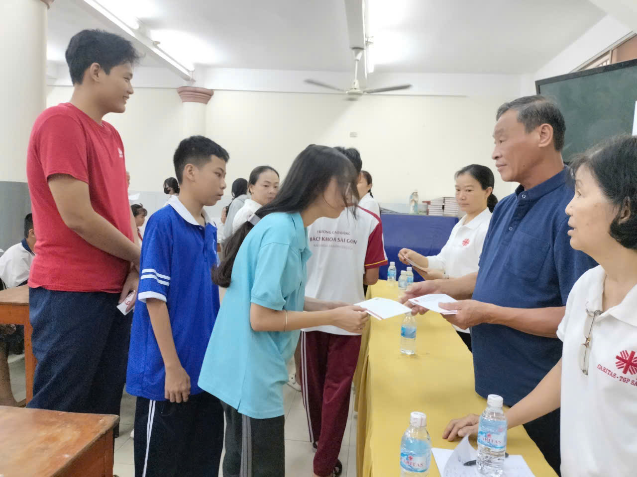 Sau đó cha linh hướng Giuse Hoàng Kim Toan và sơ Têrêsa Nguyễn Thị Phương Dung đã trao học bổng cho từng em theo từng cấp lớp trong bầu không khí hân hoan sắp đến ngày khai giảng năm học mới với những gương mặt bừng sáng vui tươi của trẻ nhỏ biết rằng mình đã được tiếp tục đến trường trong sự hỗ trợ thương yêu của quý ân nhân và Ban Giám đốc Caritas Tổng Giáo Phận Sài Gòn.