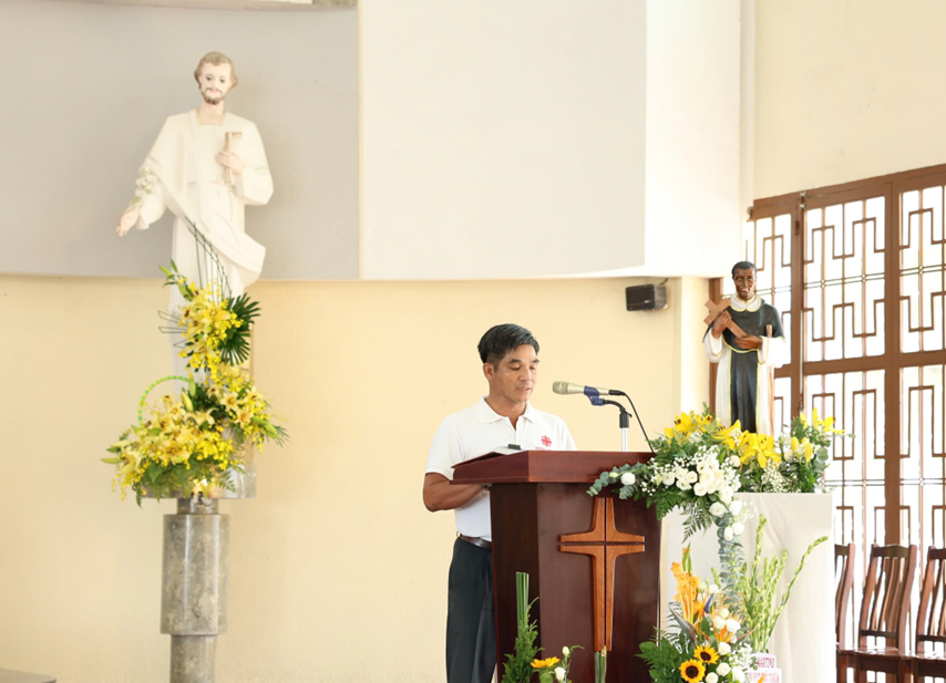 Trước khi bước vào Thánh lễ, vào lúc 09g00, linh mục linh hướng Đa Minh Đinh Công Đức đã có đôi lời chia sẻ và chào đón các anh chị em thành viên Caritas về tham dự ngày lễ mừng bổn mạng.