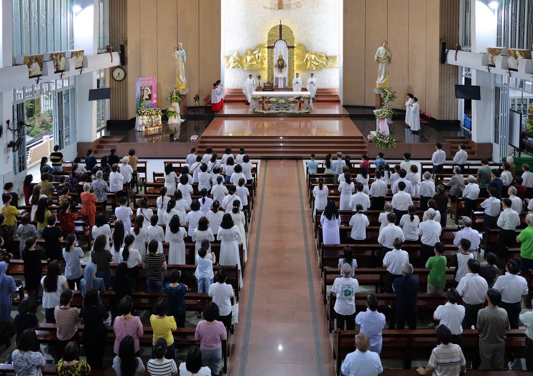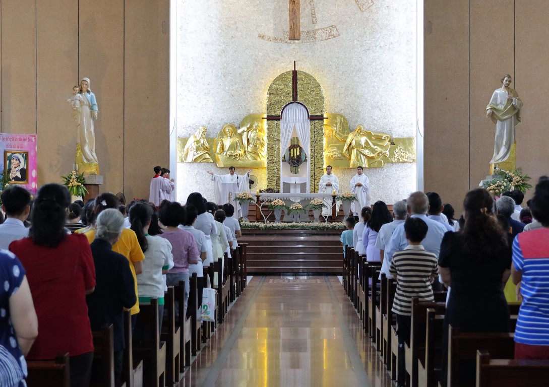 Trước Thánh lễ, cộng đoàn hướng về cuối nhà thờ đón rước đoàn dâng hương và đoàn đồng tế.