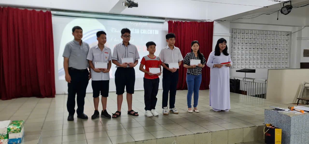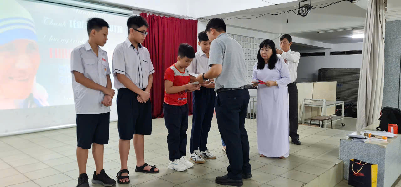 Trong buổi liên hoan có phần phát học bổng trợ cấp cho 6 em thiếu nhi đặc biệt có hoàn cảnh khó khăn trong giáo hạt. Lm Phêrô Phạm Kim Quyền - phó Giám Đốc Caritas TGP Sài Gòn đại diện trao gửi những phần quà và học bổng đến các em: