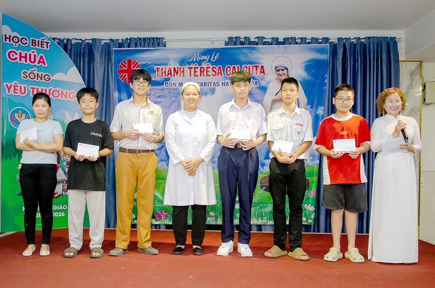 Niềm vui được nhân thêm khi Nt. Maria Nguyễn Thị Mỹ Lan, đại diện văn phòng Caritas, trao 6 phần học bổng cho 6 em thiếu nhi thuộc các gia đình đặc biệt có hoàn cảnh khó khăn trong giáo hạt Chí Hòa.