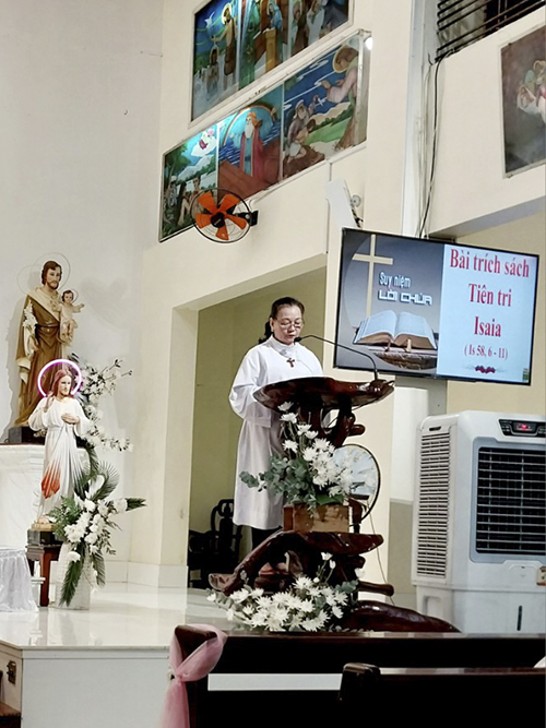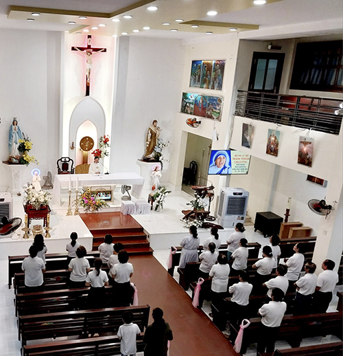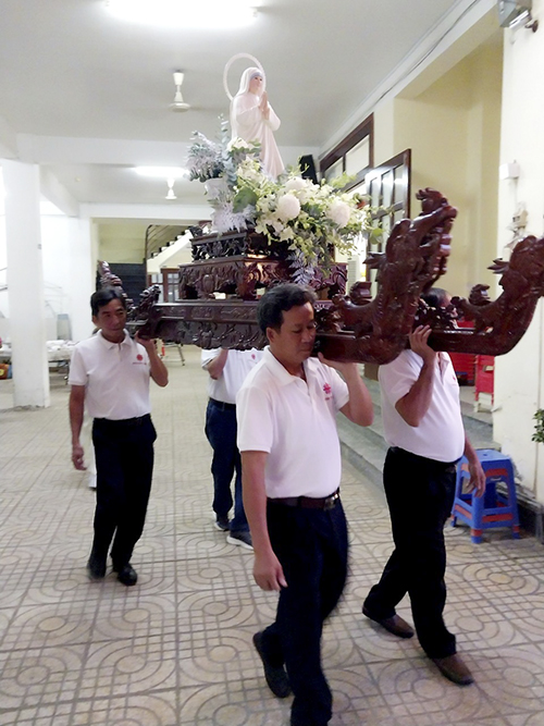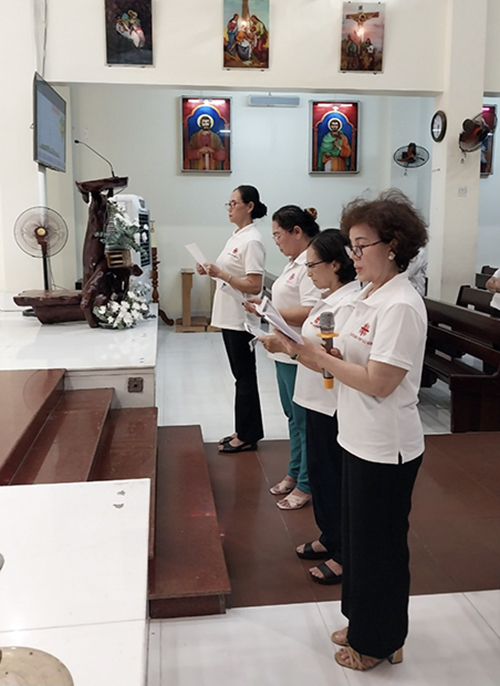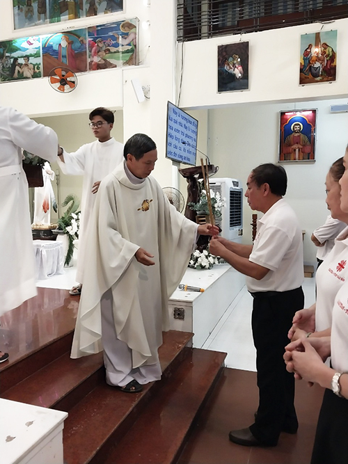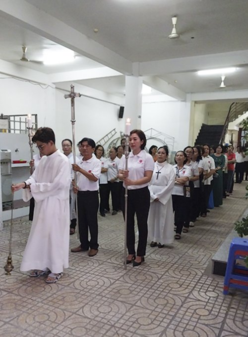 Đúng 18g00, đoàn đã khởi kiệu cùng cha Linh hướng tiến vào thánh đường. Số thành viên Caritas cùng quí ân nhân hôm này về hiệp thông mừng lễ khoảng 50 người cùng với giáo dân trong giáo xứ.