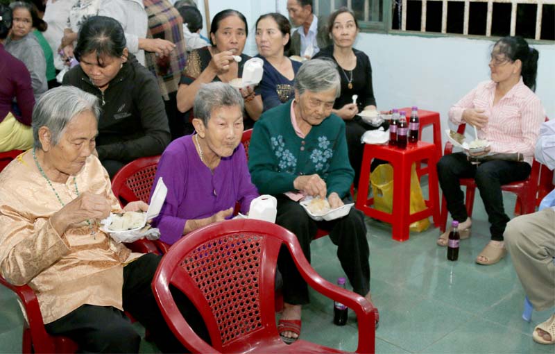 Thánh lễ xong, các giáo dân, các em thiếu nhi và các thành viên Caritas GH Phú nhuận cùng ăn xôi khúc, uống nước ngọt để chuẩn bị cho việc phát quà cũng như nhận quà. (Phải cho họ ăn vì giáo dân ở rải rác, đường về nhà khá xa khoảng 20 - 25 km nên chúng tôi phải chuẩn bị thêm phần ăn cho mọi người).