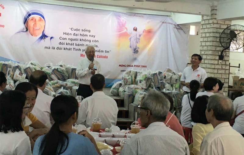 Trong lời khai mạc, Cha Hạt Trưởng Giuse Phạm Bá Lãm đã bày tỏ niềm vui với các khách mời đặc biệt: “Cám ơn các anh chị, những người nghèo, mỗi người một cảnh, hết sức khó khăn…đã đến đây để cùng chung vui với cộng đồng Giáo Xứ trong ngày Đại Lễ Chúa Sống Lại. Sự hiện diện của anh chị như là một lời nhắn nhủ rất cụ thể của Chúa đối với tất cả chúng ta –