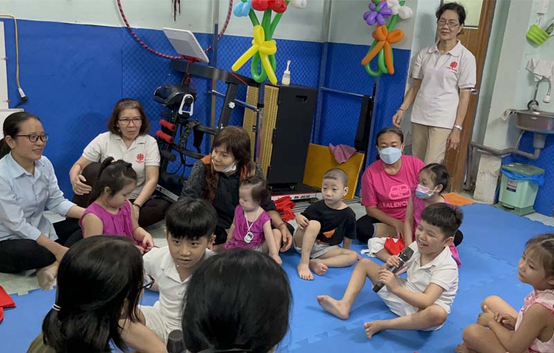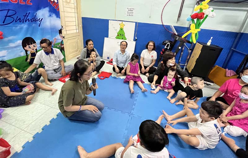 Trong chương trình mỗi cô thực hiện một phần việc, tạo nên bầu khí mang lại cho các bé nhiều niềm vui, những trò chơi vận động trí não, trò chơi vận động thể lực, những bài hát các bé được mời góp vui. Nhìn các bé cùng các cô thực hiện trò chơi, nghe các bé hát với giọng ca còn ngọng từ, nhưng tất cả những điều các bé thực hiện được là cả một quá trình chăm sóc vất vả của cha mẹ và các chuyên viên trong mái ấm giúp dần phục hồi những phần không bị tổn thương.