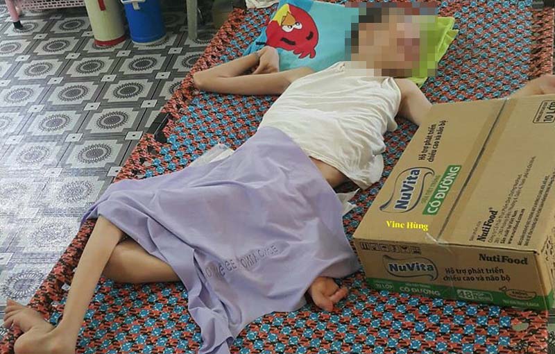Bé H.S, 13 tuổi, cầm nắm không được. Đôi mắt bé cười ngước chào khách đến thăm. Bà nội ngồi với cháu trong khung giường inox kể: