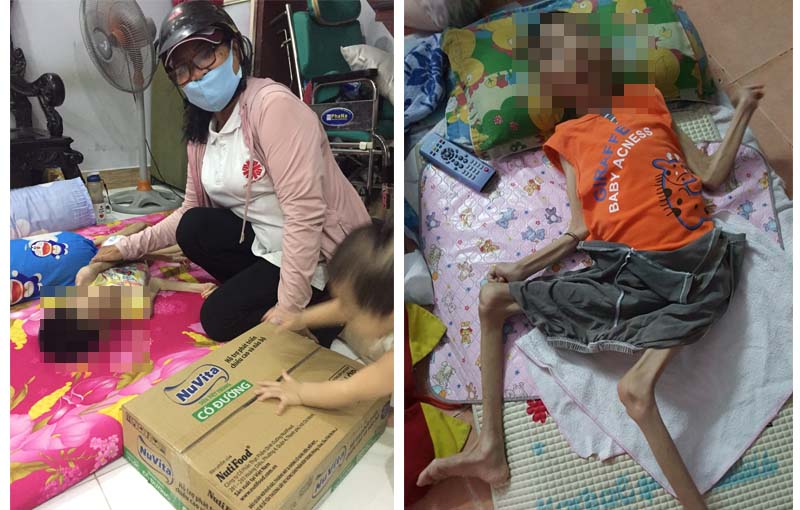 Sáng thứ Năm 10/9/2020 các anh chị Caritas Giáo Hạt Hóc Môn: anh Minh Hùng, Tiến Hùng, Đức Niên, chị Ngọc Châu, chị Bích, chị Soi, và Soeur Tuyết Minh đã chạy xe một vòng đến thăm các em khuyết tật ở trên địa bàn. Thời gian đầu các anh chị đến tìm hiểu, lập danh sách, động viên gia đình là chính. Từ tháng Ba dịch bệnh đến nay, nhận thấy các bé bị tổn thương não hầu hết phải được ẵm bế, ăn chẳng được gì ngoài uống sữa, nên các anh chị hàng tháng đến thăm đã đem chút quà sữa tã cho các bé.
