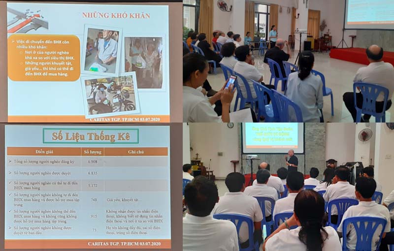 Sau đó, nữ tu Thu Thảo, người đại diện Caritas, phụ trách chương trình Bách Hóa Xanh báo cáo chi tiết phần thực hiện trong 6 đợt mua hàng của người nghèo mà Caritas giới thiệu, cho thấy Chương trình BHX thực hiện tại 6 tỉnh thành: TP. HCM. Đồng Nai, Long An, Tiền Giang, Đồng Tháp, Trà Vinh. Trong đó chiếm đa số tại TPHCM, trong tổng số 160 giáo xứ. Số lượng người nghèo được các giáo xứ giới thiệu là 6.908 người, số người được duyệt là 6.835 người, 73 người không được duyệt vì trùng số điện thoại, sai số điện thoại không liên hệ được. Nữ tu Thu Thảo báo cáo chi tiết hơn cho biết, tuy người nghèo đã nhận được tin nhắn mua hàng, nhưng trong số đó chỉ có 5.172 người tự đến trực tiếp mua hàng tại các cửa hàng Bách hóa Xanh, có 748 người vì già yếu, bệnh tật, không thể đến trực tiếp phải mua hàng tập trung qua sự giúp đỡ của các hội viên Caritas, còn lại 915 người không hưởng được phần quà, nguyên nhân là không nhận được tin nhắn điện thoại, không biết sử dụng tin nhắn qua điện thoại, nơi ở xa với BHX….
