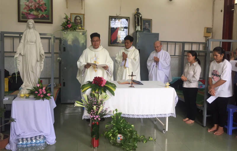Với sự giúp đỡ của các hội viên Caritas, bốn thầy đồng hành cùng mái ấm trong chương trình Mục vụ Bác ái mùa hè 2019 do Caritas TGP Sài Gòn tổ chức (thầy Martino Đinh Vũ Minh Thắng, thầy Anphongso Mai Huỳnh Duy Tân, thầy Gioan Baotixita Lê Duy Phương, thầy Giuse Lê Đỗ Nguyên) và nữ tu Maria Hoàng Thị Ngọc Hoa phụ trách ban Y tế Caritas TGP Sài Gòn, chưa đến 15g00 mọi việc đã được chuẩn bị tốt đẹp, mái ấm Hà Đông đã đông những bệnh nhân quy tụ về, Thánh lễ bắt đầu một cách sốt sắng. Nhiều bệnh nhân tuy sức khỏe không tốt, nhưng vẫn cố gắng hiện diện và tham dự Thánh lễ cùng cộng đoàn. Những lời ca chúc tụng, cảm tạ và nguyện xin được dâng về Thiên Chúa cầu nguyện cho mỗi người và toàn thể những ai đang chịu những đau đớn do bệnh tật gây nên. Thánh lễ là giây phút thiêng liêng, cầu nối nhích những tâm hồn lại gần nhau trong tâm tình phó thác cho Chúa những đau khổ nơi thân xác, bày tỏ sự cảm thông, ủi an và sẻ chia của mọi người dành cho nhau.
