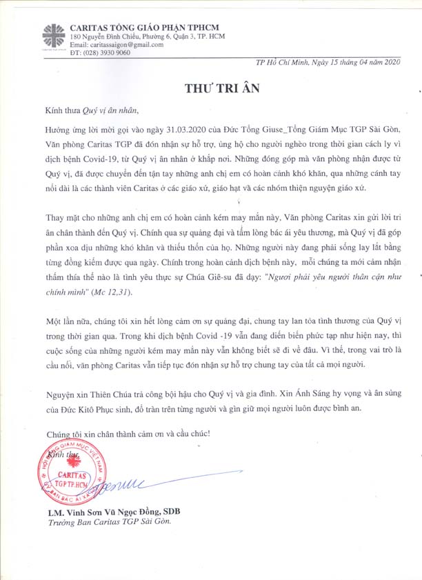 Hưởng ứng lời mời gọi vào ngày 31.03.2020 của Đức Tổng Giuse_Tổng Giám Mục TGP Sài Gòn, Văn phòng Caritas TGP đã đón nhận sự hỗ trợ, ủng hộ cho người nghèo trong thời gian cách ly vì dịch bệnh Covid-19, từ Quý vị ân nhân ở khắp nơi. Những đóng góp mà văn phòng nhận được từ Quý vị, đã được chuyển đến tận tay những anh chị em có hoàn cảnh khó khăn, qua những cánh tay nối dài là các thành viên Caritas ở các giáo xứ, giáo hạt và các nhóm thiện nguyện giáo xứ.