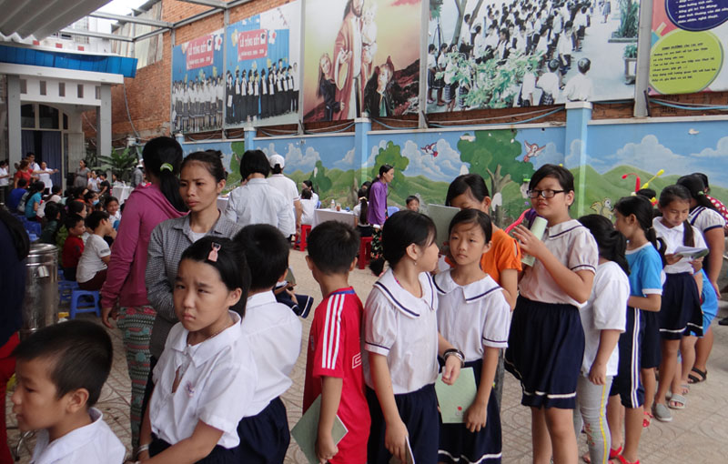 Xe dừng ở cổng Trường, mọi người chuẩn bị cho buổi khám bệnh được nhanh chóng hoàn tất. Lúc 8 giờ, bệnh nhân nhí đầu tiên được đón tiếp, công việc nhịp nhàng qua từng khâu. Khung cảnh buổi khám bệnh thật sinh động trong không gian thoáng mát, sáng đẹp của Trường. Chỗ này là kê vài chiếc bàn tiếp nhận bệnh nhân do giáo viên và các hội viên Caritas ghi tên, bên cạnh là chiếc cân và đo chiều cao, đo huyết áp, bên kia là một dãy dài bàn cho các bác sĩ khám bệnh, đi vào phòng bên trong là bàn phát thuốc, phía ngoài sân có hai Thầy Đại Chủng viện đang ngồi chuẩn bị thổi nhiều bong bóng để tặng cho các học sinh, bên cạnh là bàn tiếp ẩm thực, mỗi bệnh nhân được nhận phần bánh mì lót dạ chờ đến lượt khám, khi ra về lại nhận thêm một phần sữa bột ngũ cốc.