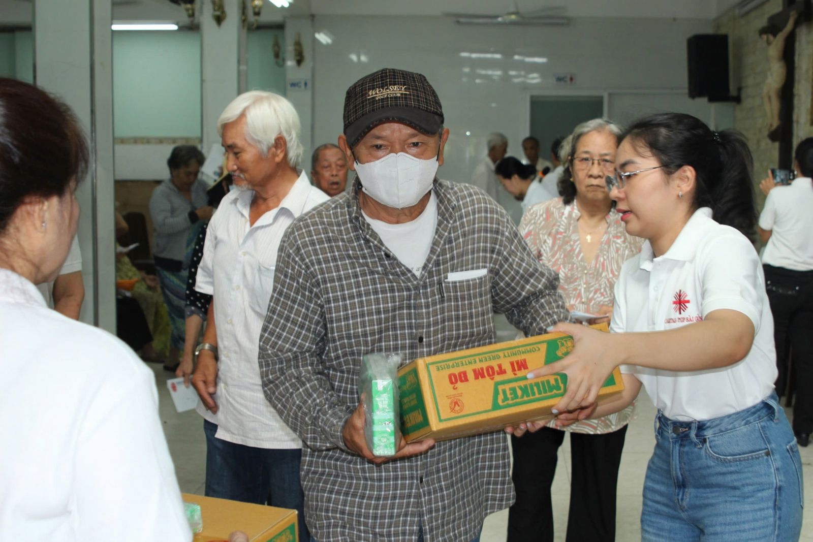 Do tháng này có lịch phụng vụ Tam Nhật Thánh và Phục Sinh, nên ban Caritas Giáo xứ phân phối quà và nhu yếu phẩm vào ngày 23/04/2025, chương trình gồm:
