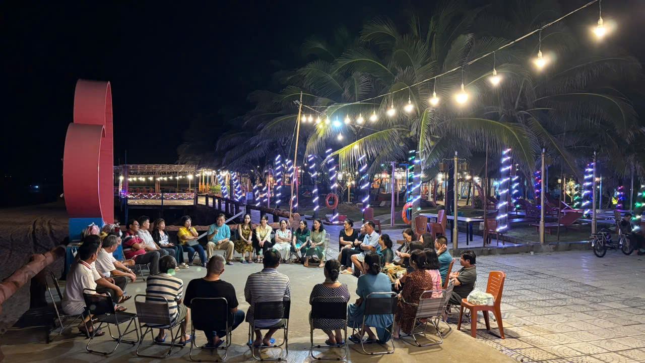 Với mấy tiếng đồng hồ tự do thư giản cùng nước và sóng biển đã tiêu hết phần dự trữ của cơ thể, thì bữa cơm chiều thật là ngon miệng với các món đặc sản miền biển đã nạp lại đầy đủ năng lượng. Sau bữa cơm chiều, một buổi gặp gỡ trò chuyện thân mật giữa Quý Cha, Quý Soeur và các thành viên BLK - một năm nhìn lại những khó khăn vất vả đã qua đi, những thành quả đã đạt được, những việc còn dang dở, những dự án đã và đang thực hiện. Quý Cha đã lắng nghe, tháo gỡ những thắc mắc từ anh em BLK tất cả với một tình yêu thương gắn kết. Yêu thương như Chúa đã yêu thương chúng ta.