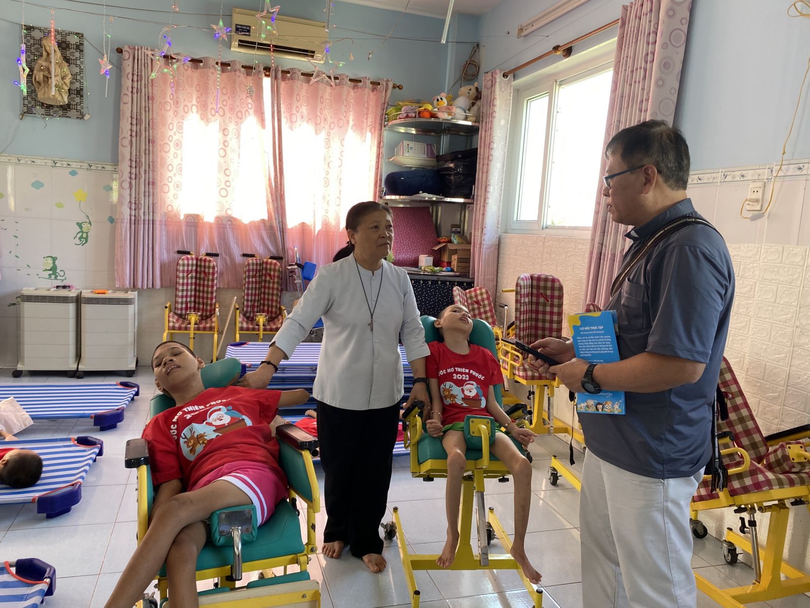 Sau đó đoàn duy chuyển đến thăm và tặng quà cho các em khuyết tật tại mái ấm chứng nhân lòng Thương Xót do Cha Giuse Phạm Thế Hiển phụ trách, tại số 140/26 tổ 11 ấp 4 Nhị Bình 10A, Xã Nhị Bình, Hóc Môn. Mái ấm có 40 em. Trong số đó có một số em bị tự kỷ, trầm cảm, tăng động, có em thì nghe được nhưng không biết nói độ tuổi từ cấp 1 đến cấp 3 không phân biệt lương giáo. Tại đây các em được quý Soeurs chăm sóc nuôi ăn học, đồng thời được chữa trị bằng các phương pháp trị liệu tâm lý. Sau thời gian chữa trị có những em trở lại bình thường và được gửi đi học ở các trường công lập trên địa bàn.