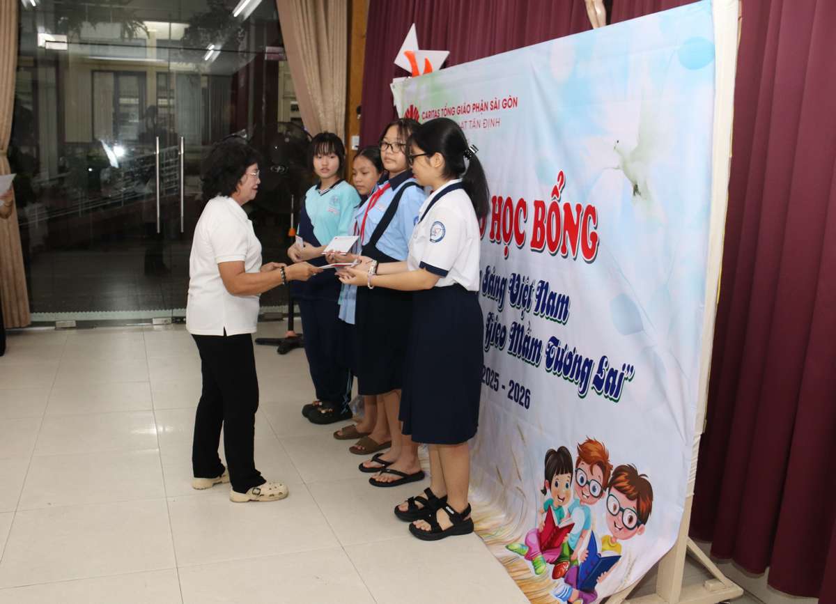 Lời nhắn nhủ này của nữ tu Scholastica Nguyễn Thị Thanh Trâm - Văn phòng Caritas Tổng Giáo Phận Sài Gòn - được gửi đến các em trong buổi lễ trao học bổng cho những học sinh có hoàn cảnh khó khăn thuộc các giáo xứ trong giáo hạt Tân Định.
