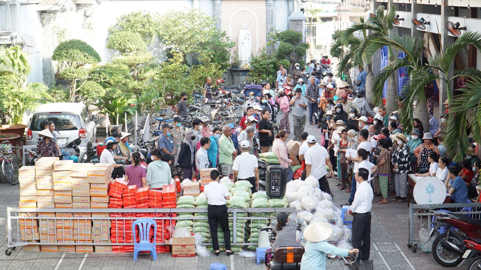 Tiếp theo, Lm Tôma Aquinô chúc lành cho mọi người và xin Chúa thánh hoá 250 phần quà, mỗi phần gồm có: 1 thùng phở Gấu Đỏ, 1 hộp bánh Chocopie, 1 chai nước mắm,1 chai nước tương, 1kg đường, 1kg bánh phở, 10kg gạo.