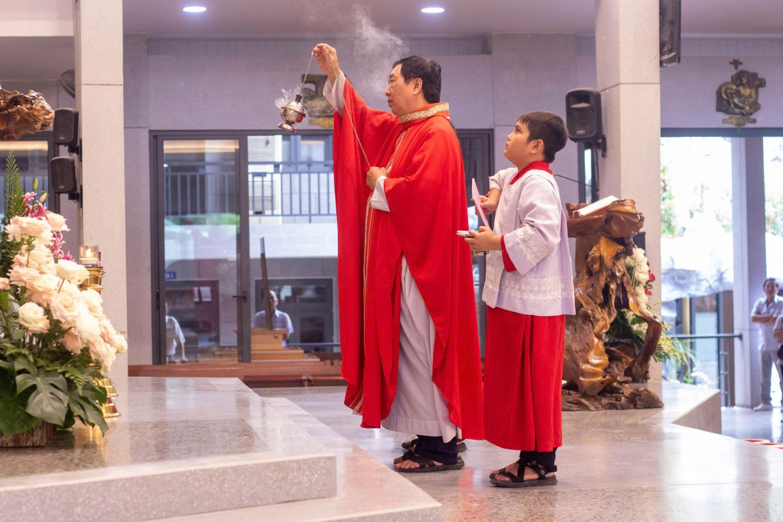 Thánh lễ bắt đầu lúc 15h00. Trước Thánh lễ, Linh mục Phêrô đã chia sẻ tâm tình tri ân: cảm ơn tất cả các Ban Caritas giáo xứ trong Giáo hạt Thủ Thiêm (Minh Đức, Thánh Linh, Thánh Tâm…) như cánh tay nối dài của các ân nhân - và đặc biệt cảm ơn Cha chánh xứ Tân Đức cùng cộng đoàn đã tiếp đón, chăm sóc chu đáo cho các em.