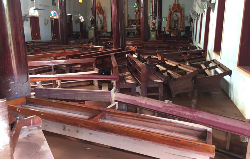 Đến nhà thờ Đoàn cũng không gặp Cha chánh xứ, khung cảnh nhà thờ ngổn ngang bàn ghế. Một giáo dân cho biết, lũ đến nhà thờ ngập cao, các ghế ngồi theo nước nổi lên lềnh bềnh, khi nước rút để lại một hiện trạng ngổn ngang như vậy, vì nước mới rút nên chưa kịp dọn dẹp.