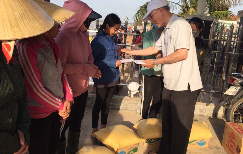 Tại đây hai Cha Giám đốc và đoàn đã trao cho bà con 250 phần quà gồm có gạo, thùng mì và phong bì 200.000, cùng những lời ân cần thăm hỏi động viên.