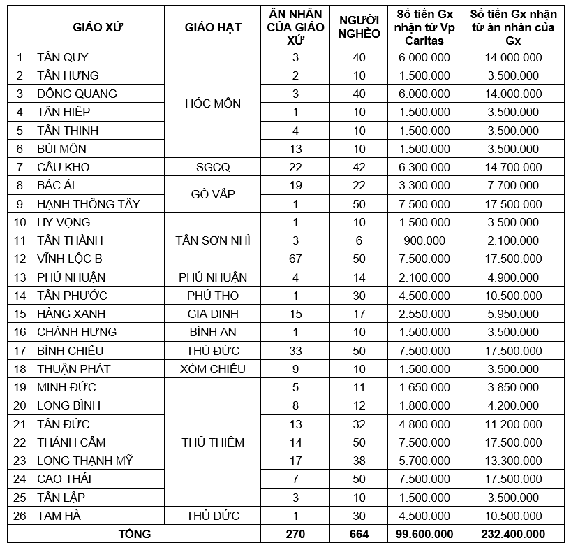 Trong tinh thần đó, Caritas giáo xứ Chánh Hưng – Giáo hạt Bình an cũng mời gọi được sự cộng tác của 1 ân nhân, mỗi tháng cũng đã giúp cho 10 người nghèo được thụ hưởng. Hằng tháng các Thành viên Caritas giáo xứ cũng đến thăm hỏi và trao phần quà của Chương trình.