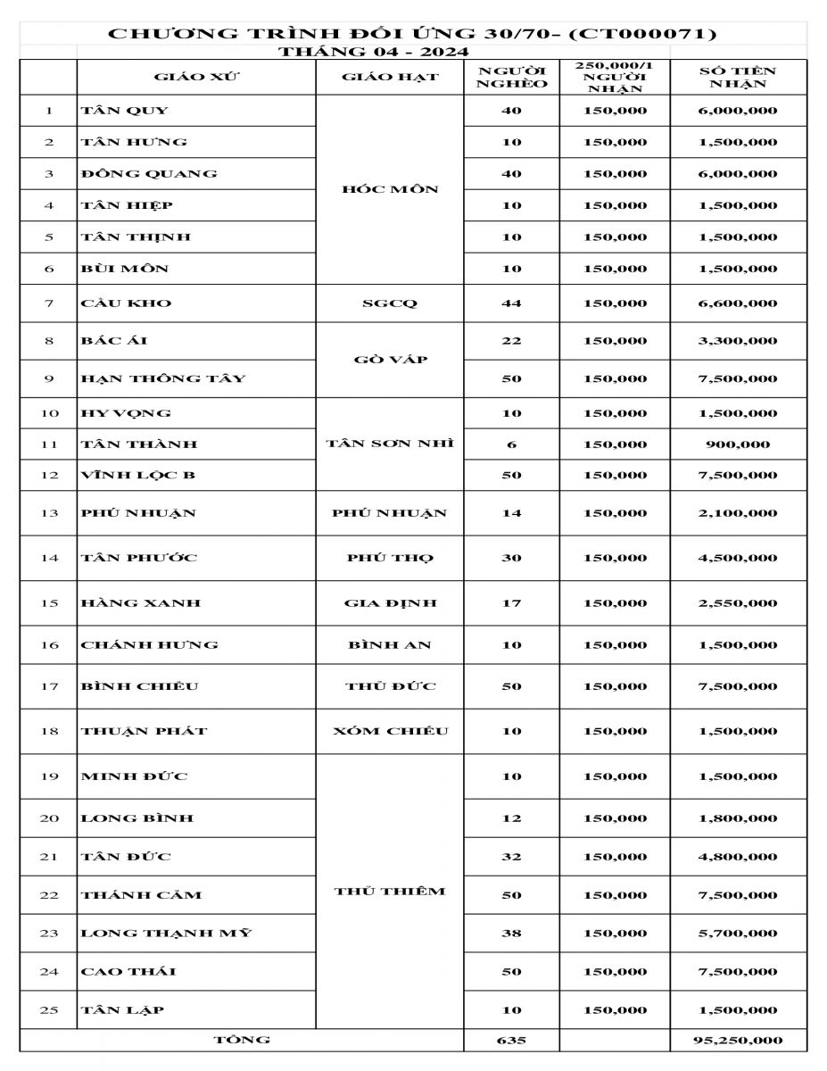 Ban Caritas BAXH xin chân thành cám ơn vị ân nhân và Các giáo xứ đã cộng tác để giúp cho các em nghèo trong tháng 4/2024 này. Nguyện xin Ba Ngôi Thiên Chúa qua lời chuyển cầu của Mẹ Maria trong tháng hoa này tuôn đổ muôn phúc lành trên Ân nhân và Các Giáo xứ.