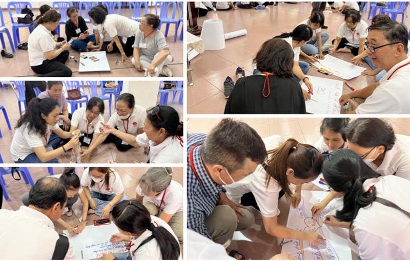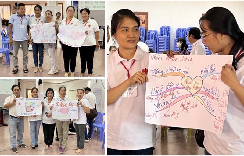 Trong ngày học tập các học viên cũng được tham gia, chia ra từng nhóm nhỏ để thảo luận vào những chủ đề của bài học, có lúc Thầy cho mọi người sắm vai, người thì là nhân viên Caritas, người thì là người khuyết tật, người nghèo, sau đó Thầy hướng dẫn bài học thực tế qua phần thảo luận và phần sắm vai.