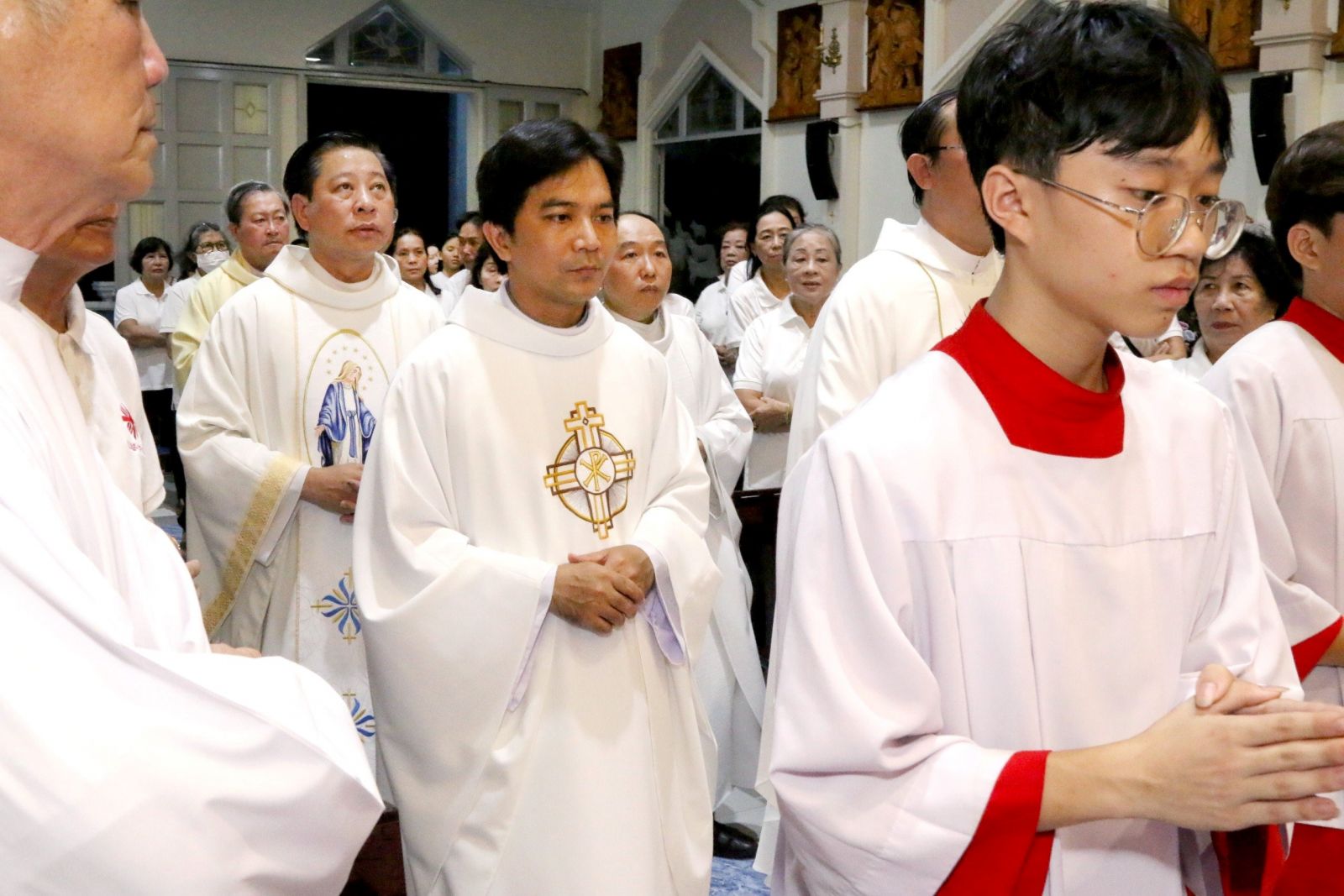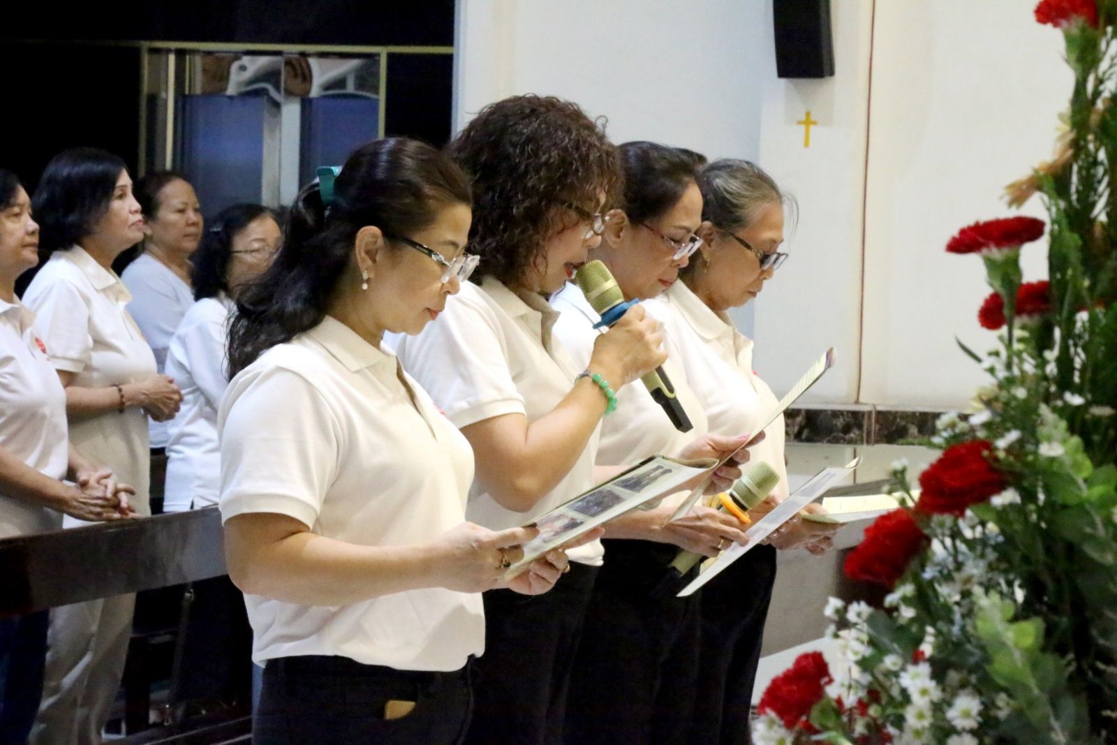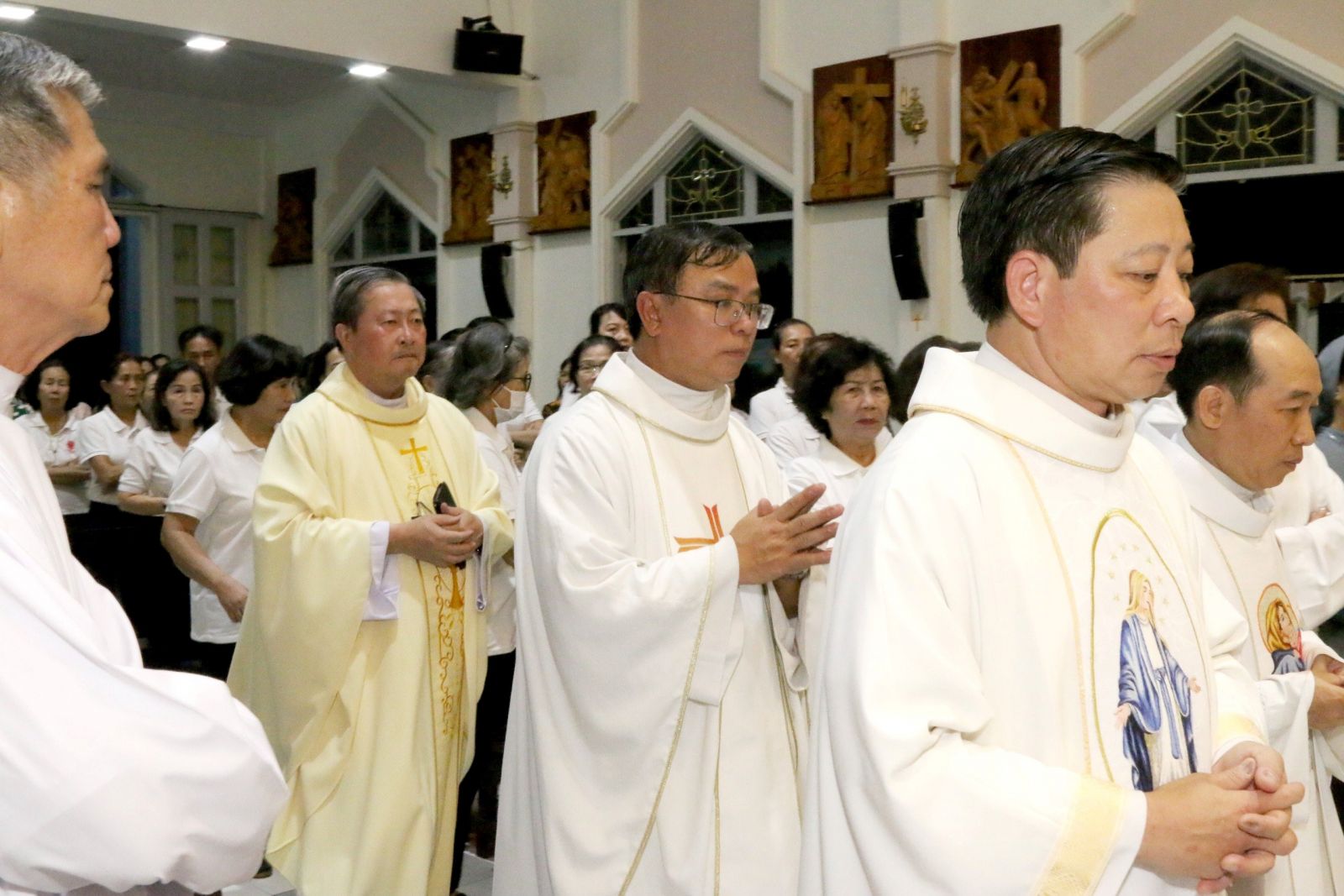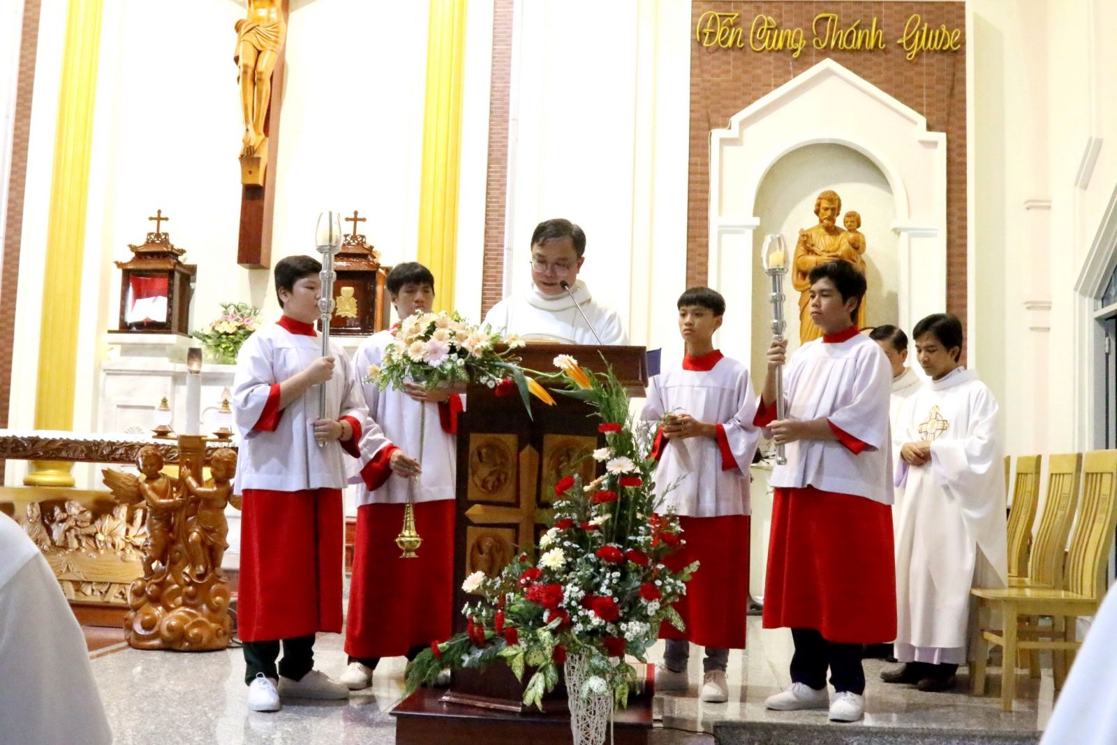 Thánh lễ đồng tế vào lúc 18h30 do Linh Mục Giuse Maria Lê Quốc Thăng - Hạt trưởng GH.Phú Nhuận chủ tế. Cùng đồng tế trong Thánh lễ có LM.Vinh Sơn Nguyễn Thành Tín, OP - Linh hướng Caritas GH.Phú Nhuận, LM.Phêrô Nguyễn Đình Đạm, OP- Phó GĐ Caritas GPSG, LM.Giuse Nguyễn Hữu Thức, cựu Chánh xứ GX.Phú Hải, LM.Phêrô Phạm Quang Ân - Chánh xứ GX.Phú Nhuận, LM.Giuse Maria Nguyễn Đức Vinh - Chánh xứ GX.Phú Quý. Cùng hiệp dâng Thánh lễ có các Soeurs đại diện VP Caritas GP SG, Quý Chức HĐMV các Giáo xứ trong GH, các anh chị đại diện BLK các GH bạn trong GPSG và hơn 50 thành viên Caritas GH Phú Nhuận và cộng đoàn dân Chúa,