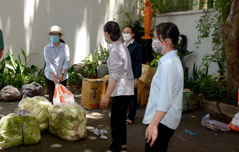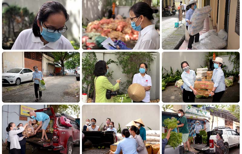 Vậy mà, sau khi làm xong nhóm nữ tu nghỉ ngơi đôi chút, là đến giờ kinh nguyện dành cho đời sông thiêng liêng của người Tu Sỹ. Sau giờ kinh là bữa điểm tâm sáng, nhóm nữ tu tiếp tục chuẩn bị chia các phần hàng cứu trợ tới các nơi như:‘Giáo hạt, giáo xứ, mái ấm, khu cách ly, khu phong tỏa, các bếp ăn, các nhà trọ gặp khó khăn, trao tận nơi những bó rau nghĩa tình và những lương thực cần thiết cho sự sống con người ngay trong cơn dịch bệnh, để rồi mình lại nhận được sự giúp đỡ từ mọi người’.