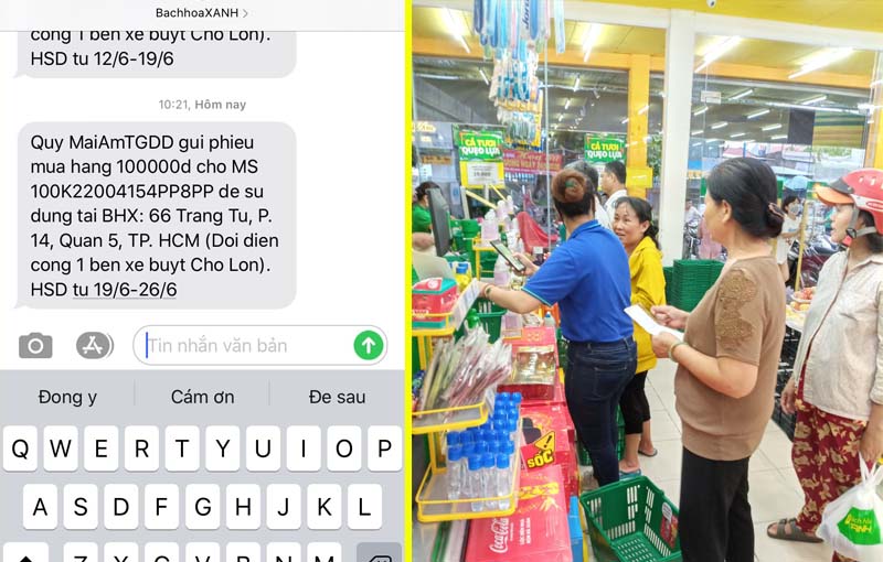 Rồi đến ngày người nghèo nhận được tin nhắn đầu tiên_ngày 15.05.2020, có nhiều người khi nhận được tin nhắn, vui quá bấm nhầm xóa mất tin. Có người thì nôn nao vì thấy nhà hàng xóm nhận được tin mà mình chưa nhận được...Không để mặc họ, các thành viên Caritas đã gửi phản hồi cho văn phòng và rồi các sự cố cũng được khắc phục. Trong thời gian Phiếu có giá trị, các anh chị em Caritas vẫn luôn tích cực hỏi thăm, hướng dẫn và đồng hành với những người gặp khó khăn khi đi nhận hàng ở các cửa hàng BHX. Không khí mua sắm ở các cửa hàng BHX cũng trở nên nhộn nhip hơn với việc đón tiếp người nghèo đến nhận hàng cách niềm nở và nhiệt tình… Trên thực tế thì đến ngày 19.06.2020, BHX đã gửi tin nhắn đợt thứ 6 cho người nghèo. Nhiều người ngạc nhiên khi nhận được tin nhắn lần thứ 6, nhưng rồi càng vui hơn vì được chương trình tặng thêm một lần nữa.