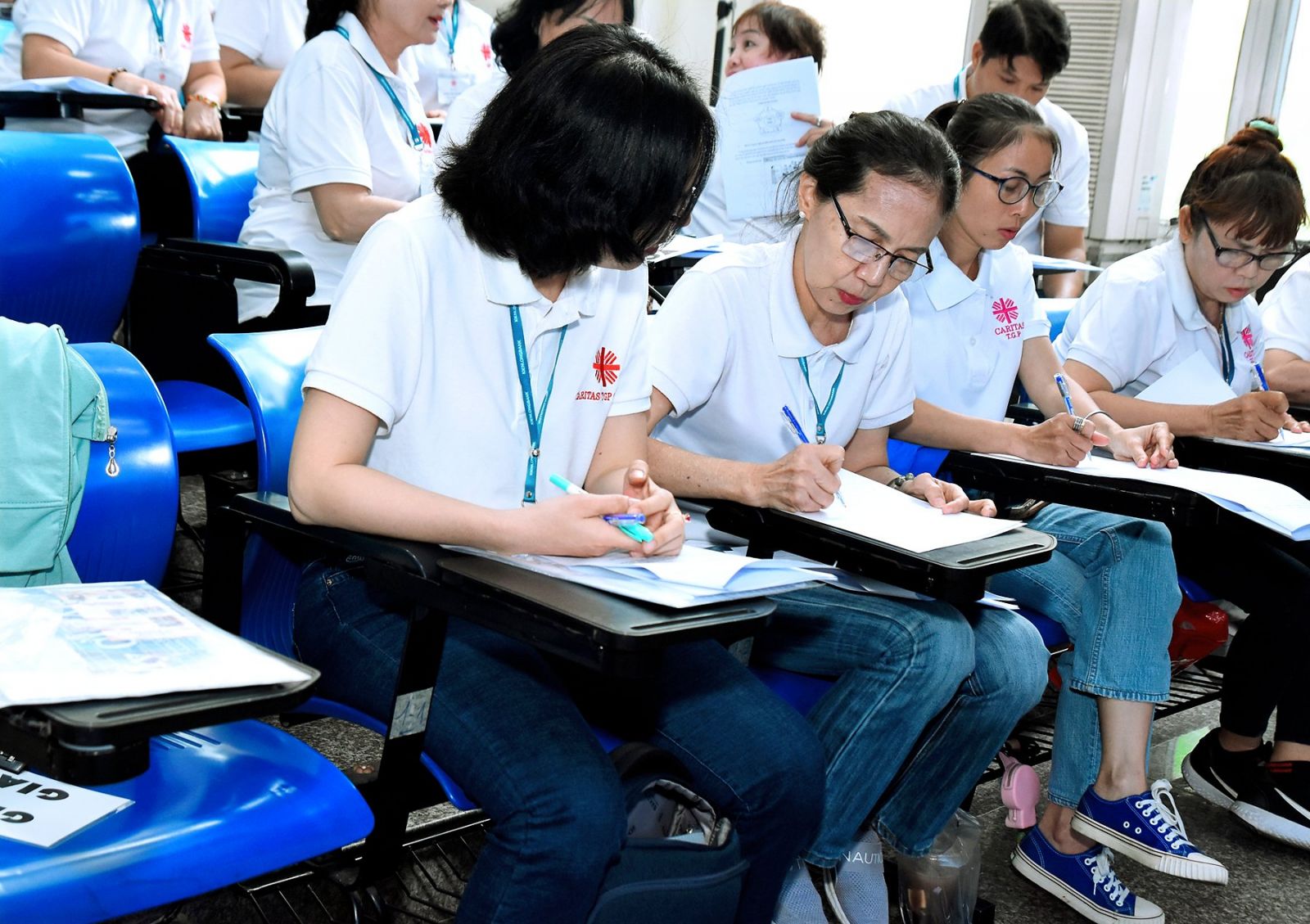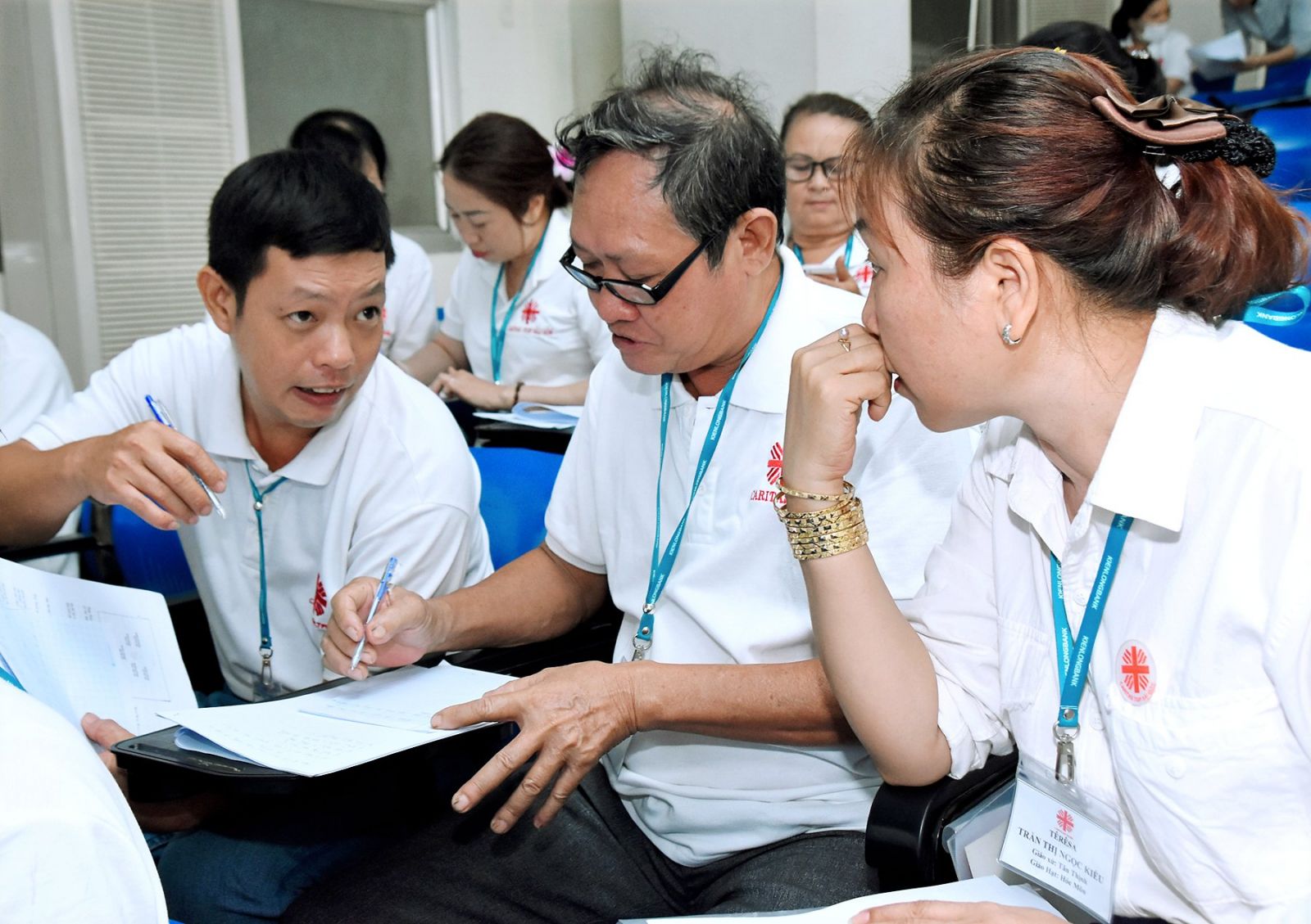 3- Sự cộng tác đắc lực của Ban Liên Kết Caritas: Xuyên suốt 3 ngày của Khóa Tập huấn là sự đồng hành và hỗ trợ nhiệt tình của quý Cô – Chú thành viên Ban Liên Kết của 14 giáo hạt, từ việc giữ xe, chuẩn bị bàn ghế đến việc chuẩn bị ăn uống trong giờ giải giao, đồng hành, điểm danh tham dự viên…