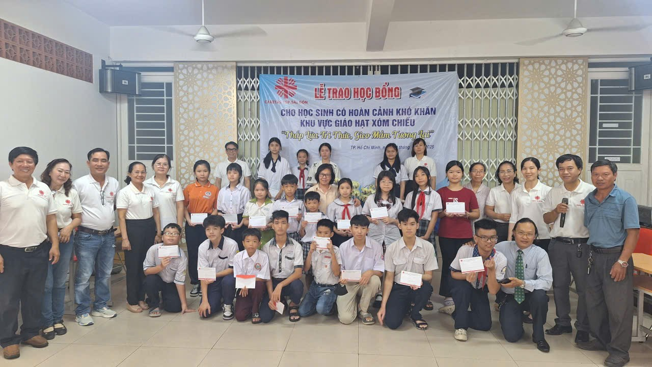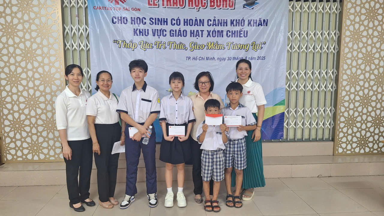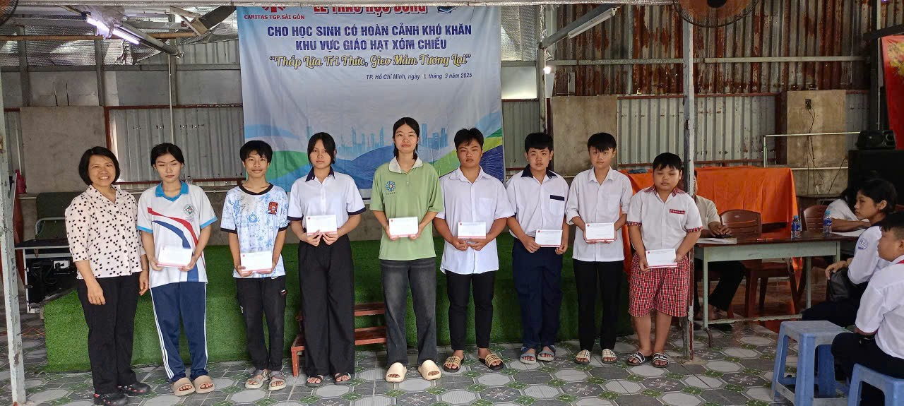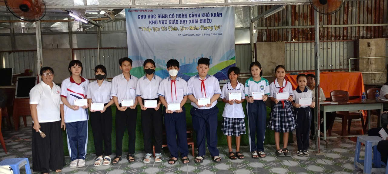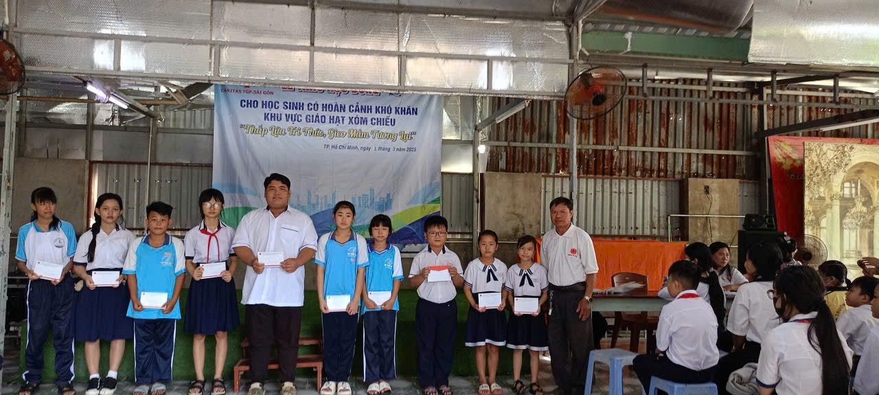 Thực hiện chương trình Con Đường Sáng Việt Nam với Chủ đề: “Thắp lửa tri thức, gieo mầm tương lai” vào sáng Thứ bảy ngày 30/08/2025 và sáng Thứ 2 ngày 01/09/2025, ban Caritas giáo hạt Xóm Chiếu đã phối hợp với văn phòng Caritas TGP Sài Gòn để trao học bổng cho 70 em học sinh có hoàn cảnh khó khăn không phân biệt tôn giáo tại khu vực các giáo xứ thuộc giáo hạt Xóm Chiếu. Do giáo hạt Xóm Chiếu khá rộng và để thuận lợi cho việc nhận học bổng, BLK hạt Xóm Chiếu đã tổ chức trao học bổng tại 2 địa điểm là giáo xứ Tắc Rỗi và giáo điểm Doi Lầu (giáo xứ An Thới Đông - Cần Giờ).