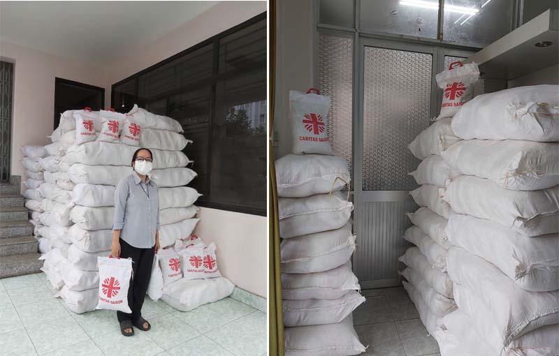 Ngày 4/7/2021, hai ân nhân đã chuyển đến văn phòng Caritas 10 tấn gạo, (Ông Bà GB. Trần Ngọc Đức 5 tấn gạo, và gia đình Cô Trần Thụy Thùy Dung 5 tấn gạo). Với tình trạng cấp thiết, có gạo là trao ngay, trong ngày 05/7/2021, văn phòng Caritas TGP đã gửi đến người nghèo qua sự chuyển giao của Ban Liên Kết Caritas 14 giáo hạt trong TGP Sài Gòn, mỗi Giáo hạt 500 ký gạo.