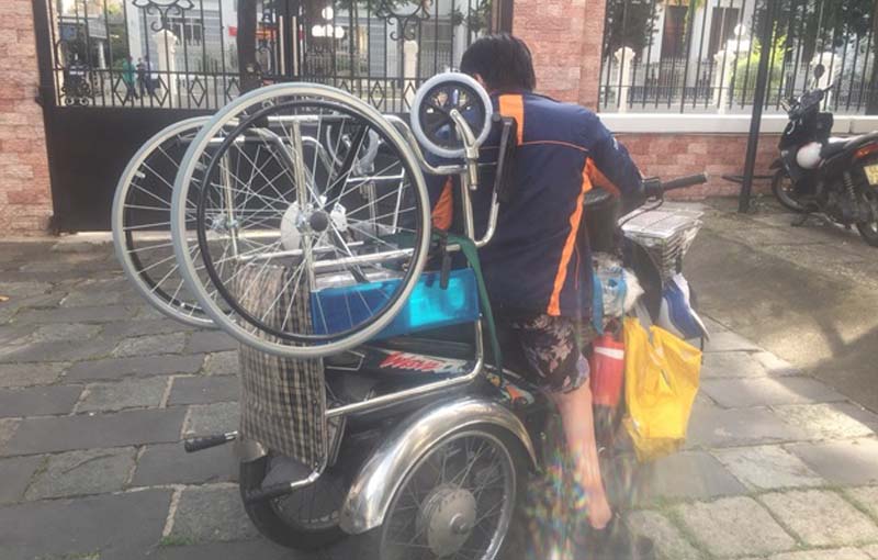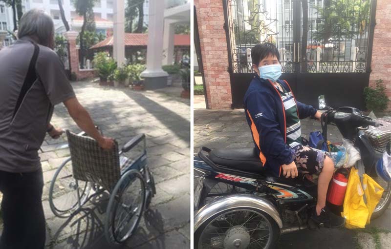Chị L.T.M, bị bại liệt và mồ côi từ nhỏ. Chị được tặng xe lăn để đi bán vé số.