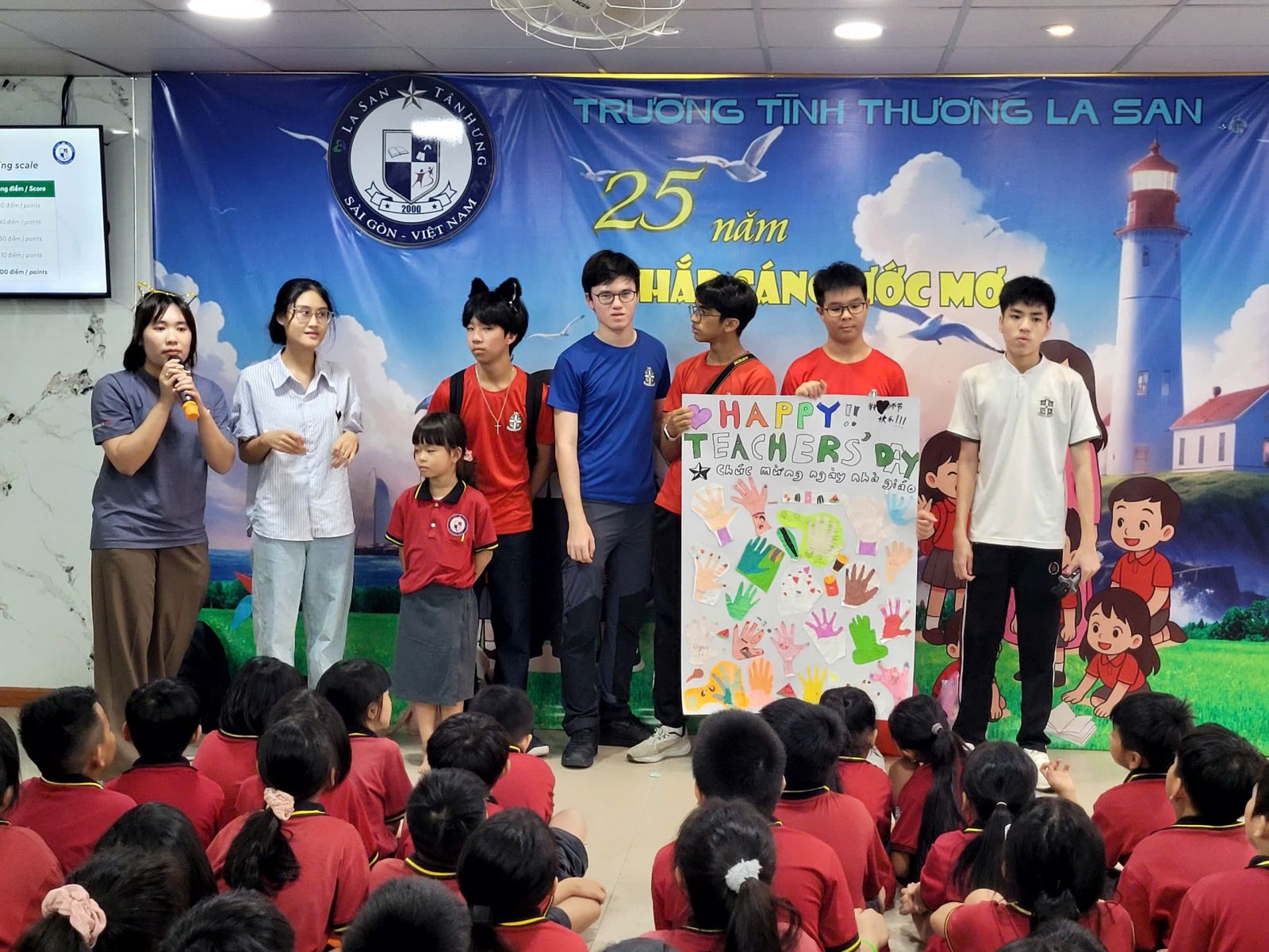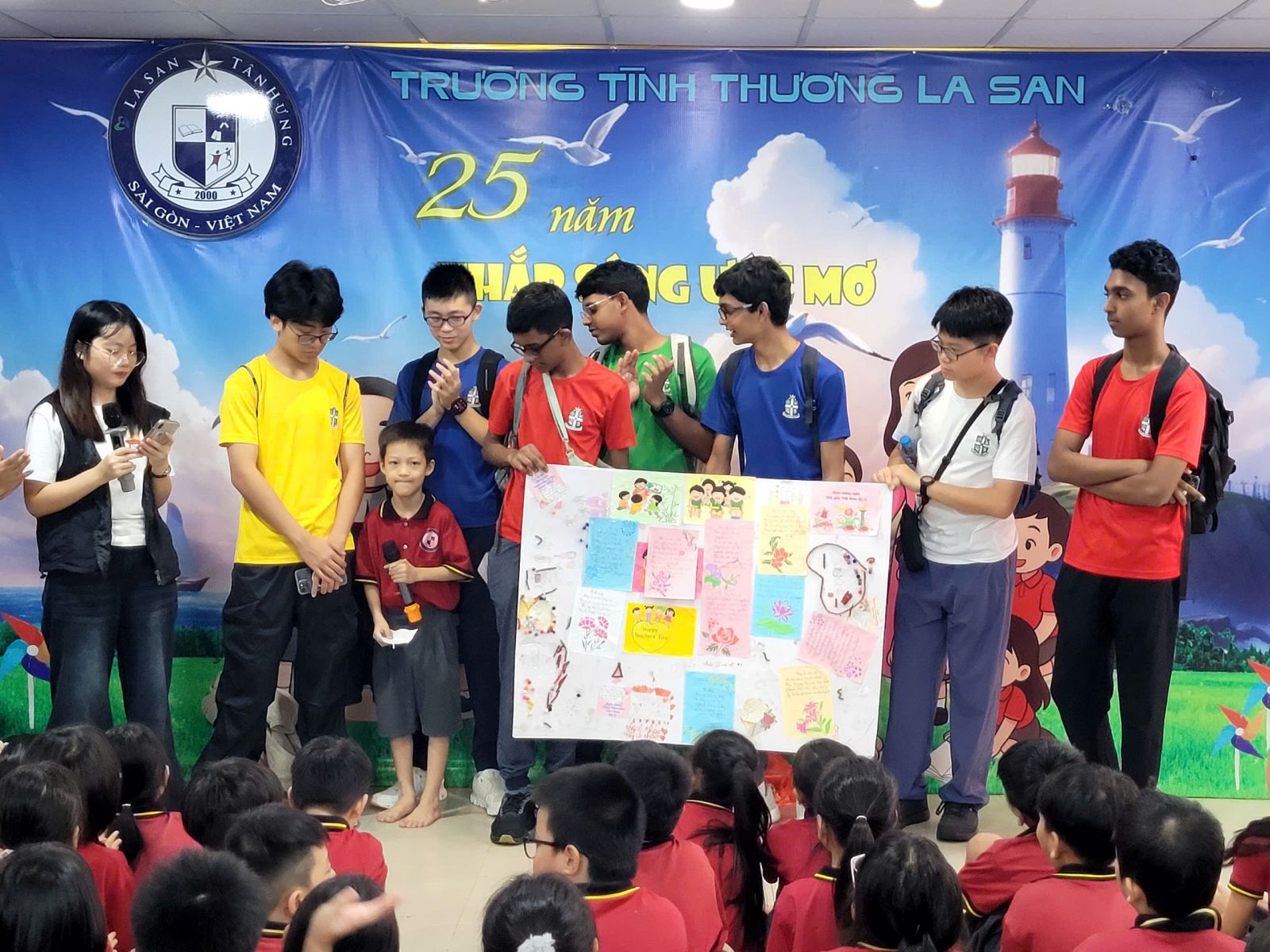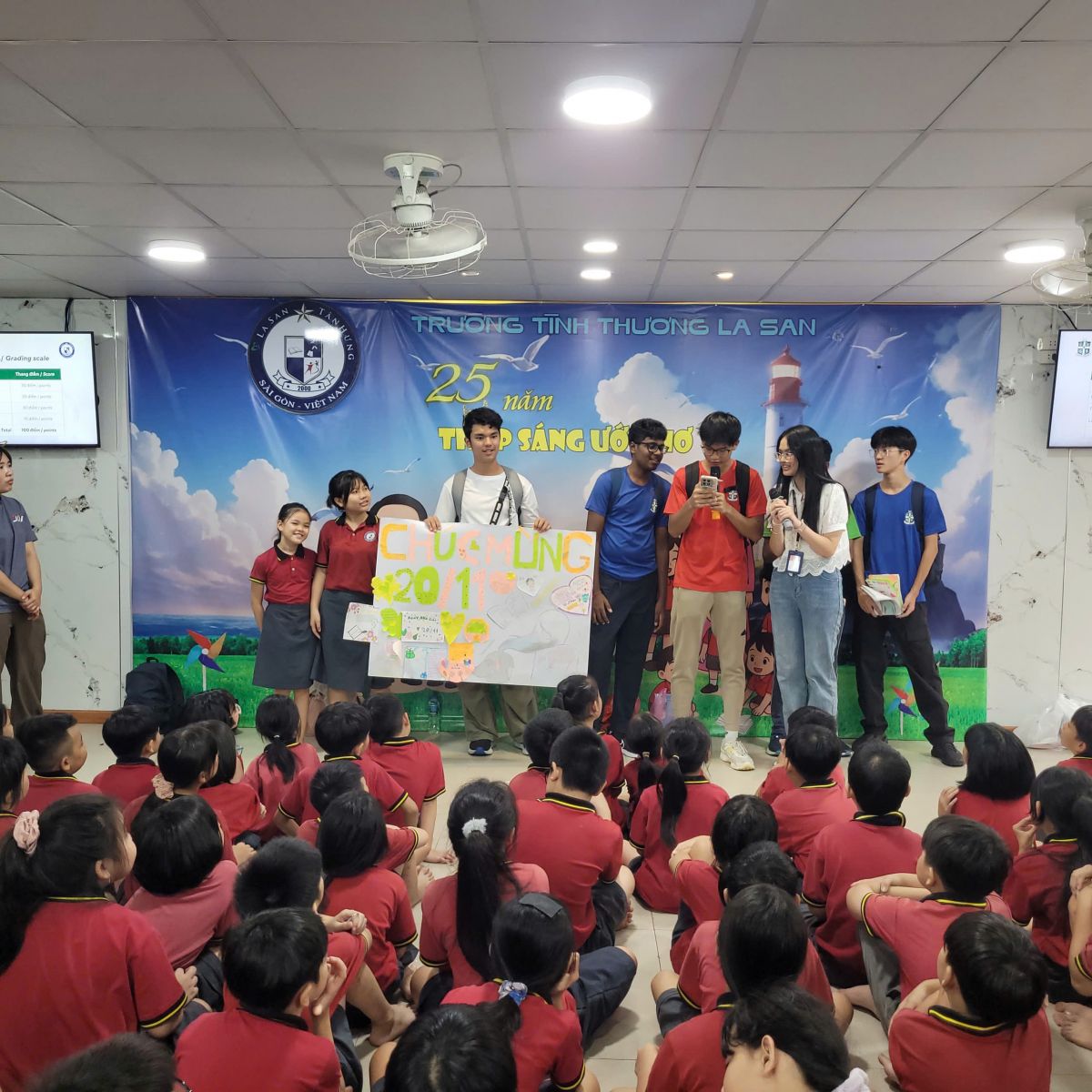 Tiếp nối không khí đó, trong buổi lễ 20/11, các em học sinh được tham gia hoạt động tìm hiểu về Thánh Gioan La San – vị thánh suốt đời dấn thân cho giáo dục và là người đã gieo vào thế giới thông điệp “Giáo dục là hành trình của tình thương”. Qua phần chia sẻ, các em hiểu hơn rằng việc được đến trường hôm nay là một món quà rất lớn đến từ bao tấm lòng.