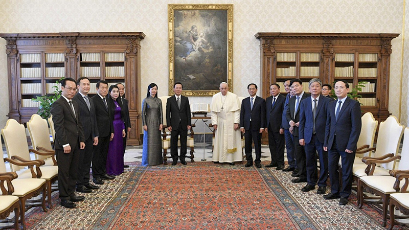 Vào lúc 3 giờ chiều ngày 27/7/2023, Đức Thánh Cha đã tiếp Chủ tịch nước Võ Văn Thưởng tại Thư viện Dinh Tông tòa. Sau cuộc gặp gỡ kéo dài khoảng 20 phút, Đức Thánh Cha đã tặng mỗi thành viên trong phái đoàn Việt Nam một huy chương của Giáo hoàng.